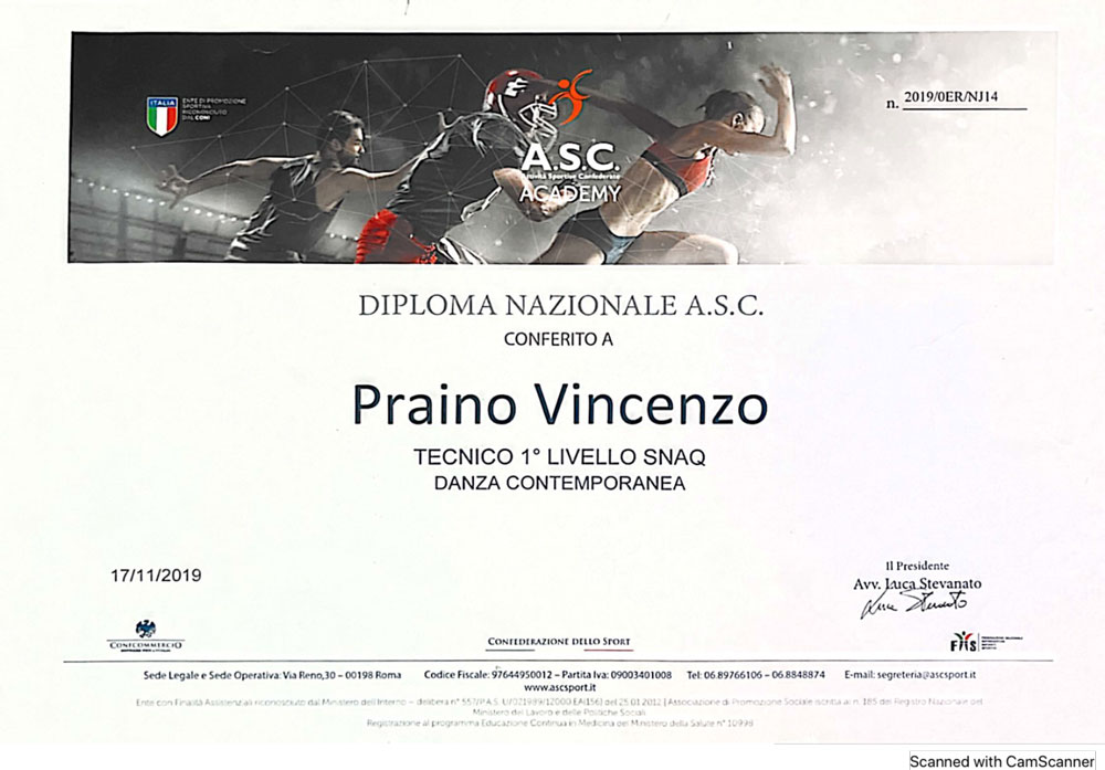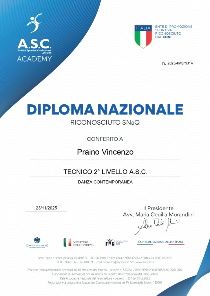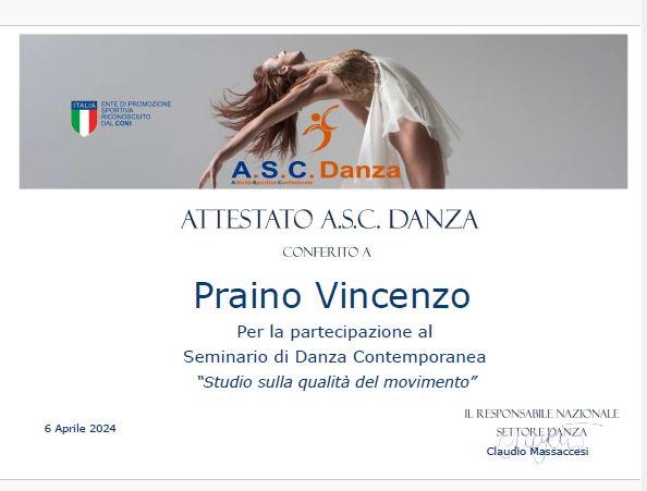 - Diploma Insegnante Danza Contemporanea – Primo livello presso Asc Danza (Roma)Corso Eseguito da Eleonora Galante e Irma Carpino Nelle Seguenti Date: