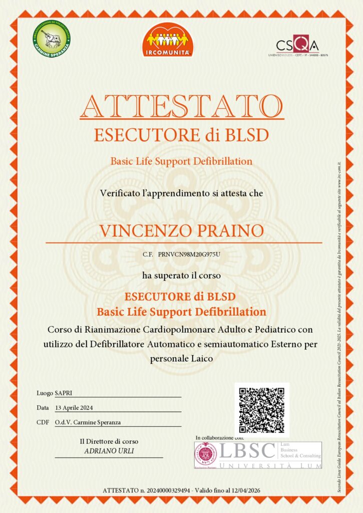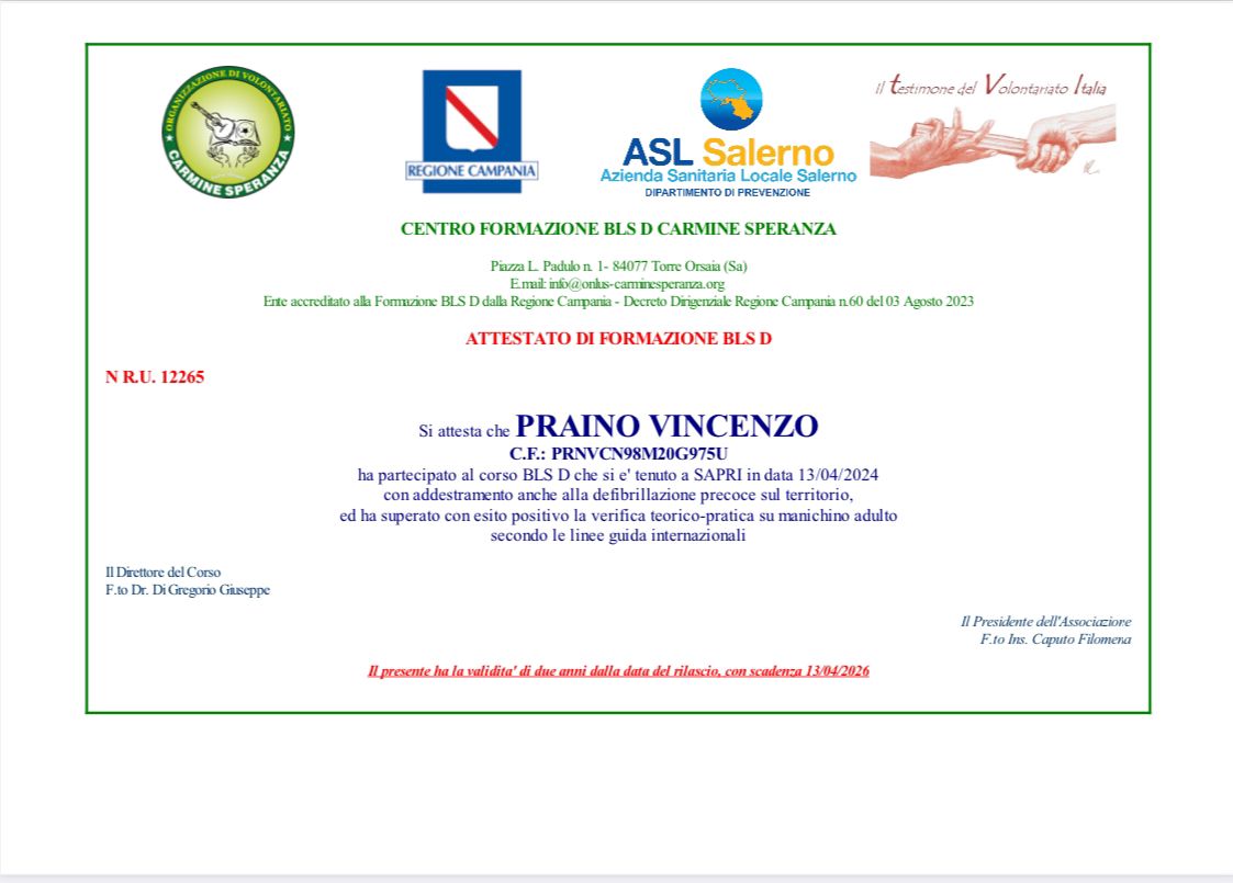 - 13/04/2024 ho eseguito il corso blsd con la IRCOMUNITA’ PRESSO L ASD POLISPORTIVA OKINAWA SAPRI (SA)